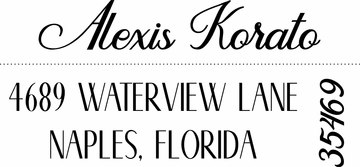 Show your style with this unique custom self inking stamp that features a side zip code. The Alexis Custom Ink Stamp is designed with high style fonts and high design.